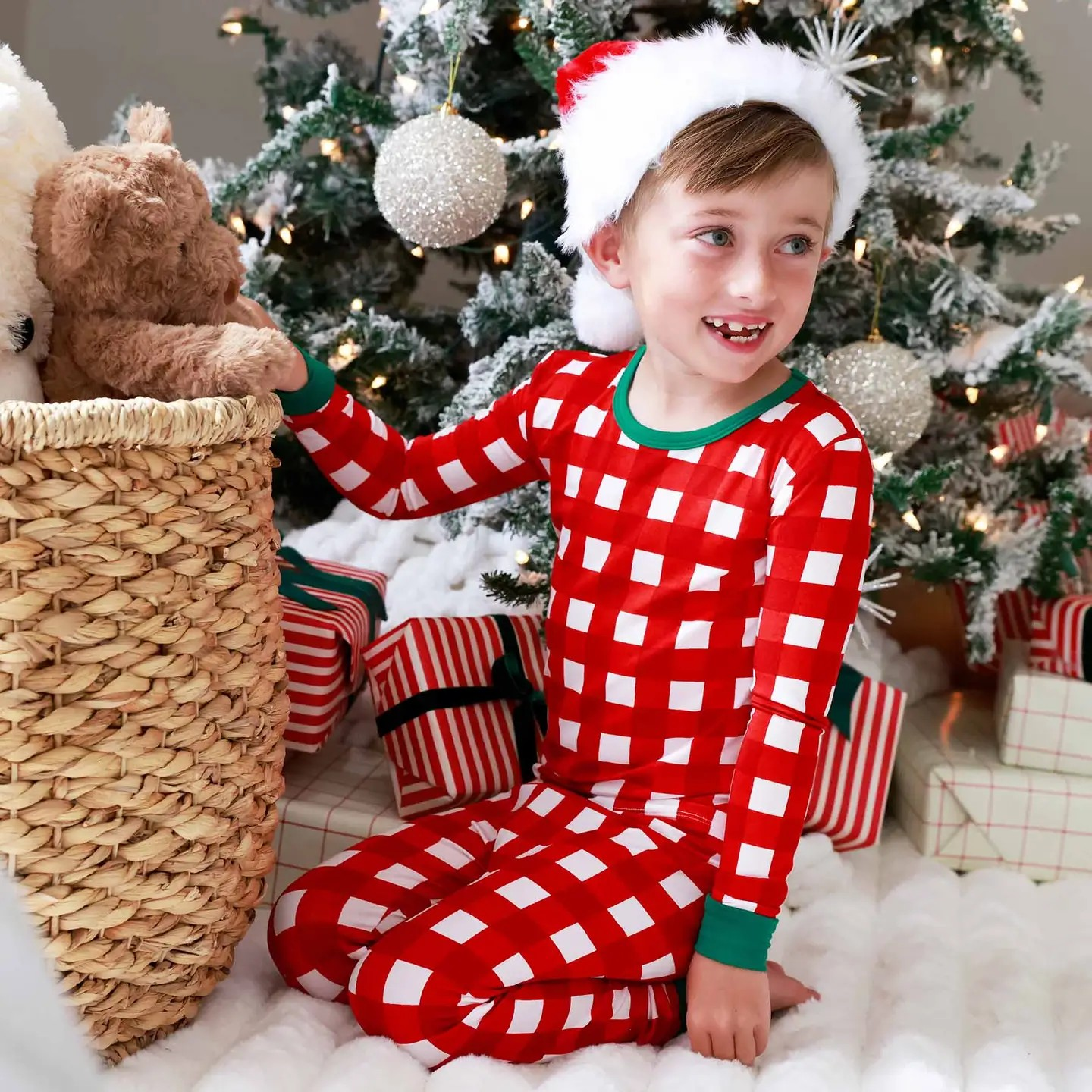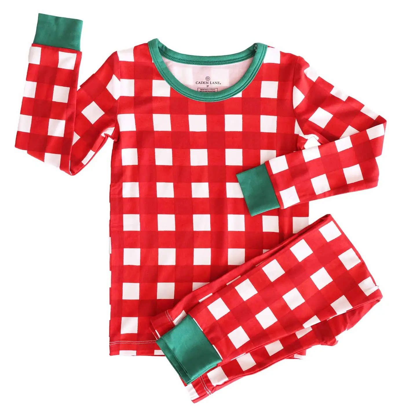 Two Piece Pajama Set Details: * 95% Bamboo Viscose | 5% Spandex * Breathable bamboo ideal for sensitive skin * True-to-size, * Set Includes: 1 Long Sleeve Top & Pant * For child's safety, this garment should fit snugly. This garment is not flame resistant. Care Instructions: * Machine Wash Cold - Gentle Cycle * Phosphate Free Detergent Recommended for Color Care * Wash with like fabrics (bamboo only) * Layette should be washed inside out * Line Dry / Air Fluff * Do NOT use Fabric Softener The Christmas Two-Piece Pajama Sets are made for merry mischief and magical mornings. With a snug fit and plenty of stretch, kids can dance around the tree, sneak a peek at presents, or snuggle in for a Christmas movie marathon—all while wrapped in the softness of bamboo viscose. The cheerful check makes it picture-perfect for family photos and festive traditions, turning every holiday moment into a memory worth keeping.