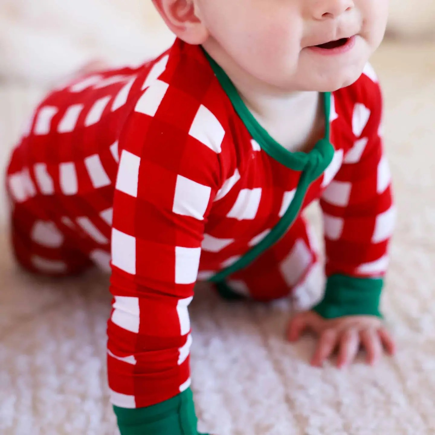 Convertible Zip Romper Details: * 95% Bamboo Viscose | 5% Spandex * Convertible Double Zipper Romper with flip mitts & footies (up to size 6-12 months) * Double Zipper for easy dressing & diaper changes * True-to-size, with extra room in the length to grow with baby * Includes: 1 Convertible Zip Romper (Accessories sold separately) Care Instructions: * Machine Wash Cold - Gentle Cycle * Phosphate Free Detergent Recommended for Color Care * Wash with like fabrics (bamboo only) * Layette should be washed inside out * Line Dry / Air Fluff * Do NOT use Fabric Softener Our Christmas Convertible Zip Rompers are ready to keep up with every holiday celebration! The footed-to-footless design means it can go from cozy naps to festive playtime in a snap, crafted from buttery bamboo viscose that is perfect for Christmas morning. From holiday movie marathons to cookie-baking, this romper is the comfy-cute staple that makes Christmas memories even sweeter.