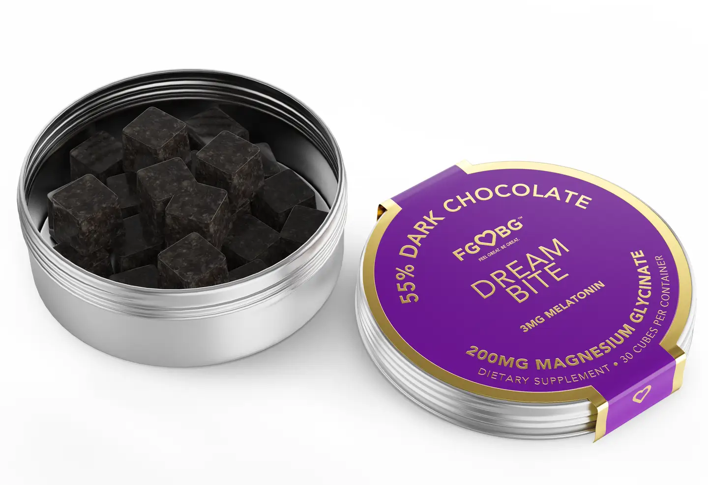 Dream Bite combines 3mg of melatonin and 200mg of magnesium with 55% dark chocolate to support restful sleep and relaxation. Each container includes 30 convenient cubes, designed to help you feel great and enhance your well-being naturally.