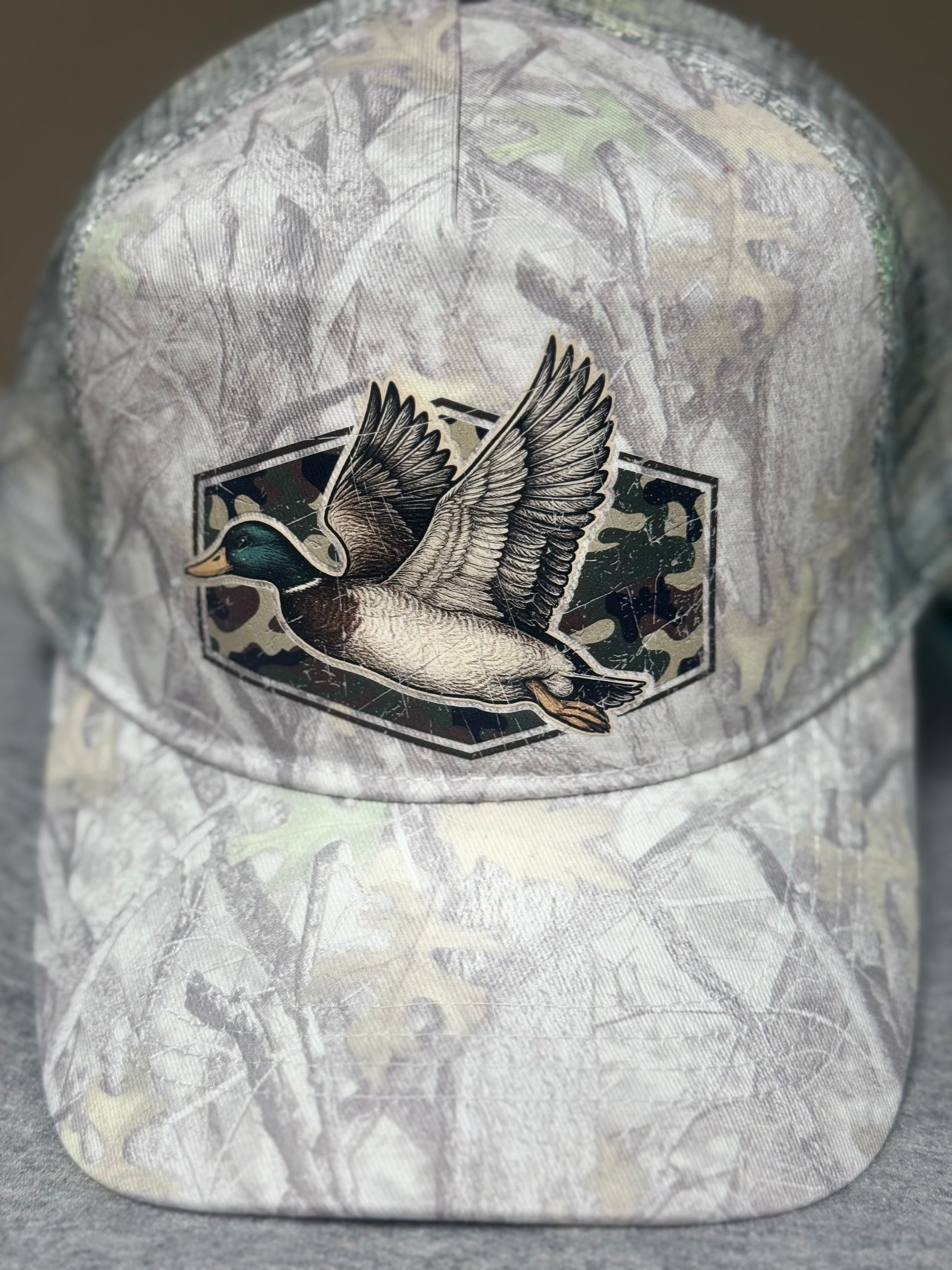 Duck In Flight Hat in girlie gray camo—because girls love camo too. This expert-crafted hat combines tactical style with feminine flair, featuring a classic duck silhouette design rendered in sophisticated gray camouflage. Perfect for outdoor enthusiasts who refuse to compromise on style, the structured fit and quality construction deliver both durability and everyday wearability. Whether you're heading to the field or the street, this hat makes a bold statement that camo belongs to everyone.