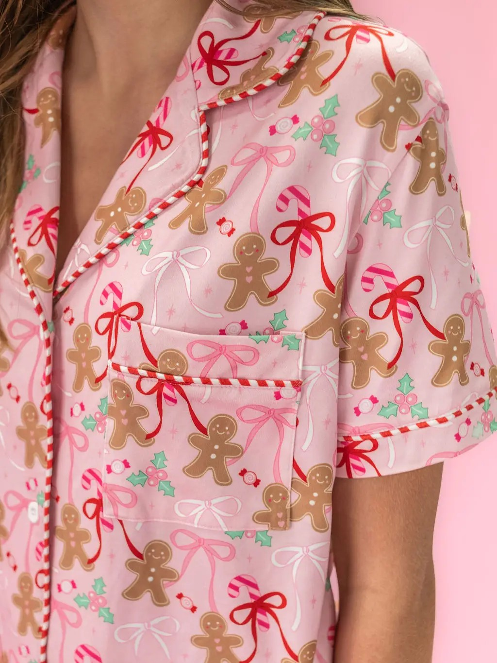 Get cozy with the cutest combo of sweet and festive! Our Gingerbread Bows design for Christmas 2025 features smiling gingerbread cuties, swirly candy canes, holly sprigs, and swoopy bows all dancing across a pink background. Finished with candy cane striped piping for an extra pop of holiday cheer, this print brings sugar, spice, and everything nice to your Christmas morning (or your cocoa-fueled movie marathon). Whether you're wrapping gifts or just lounging in style, this PJ set is made for holiday magic!