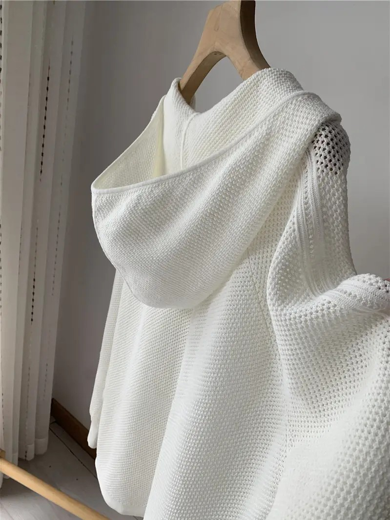 This Hooded Knit Pullover features a missy silhouette with a solid pattern and long sleeves, designed to offer a loose and comfortable fit. Its hollow-out details add a subtle touch of style while maintaining practicality, making it an ideal layering piece for cooler days.