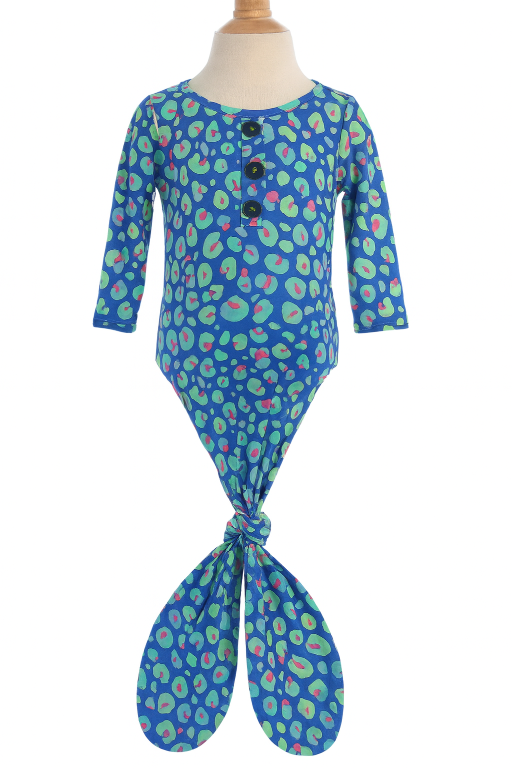 This newborn-sized Miley Leopard Baby Gown is crafted from ultra-soft, stretchy bamboo viscose, ensuring gentle comfort for babies up to 3 months (12 lbs). Designed with convenient shoulder slits and coordinating buttons, it allows easy dressing from the top down. The adjustable knot at the bottom simplifies quick diaper changes, while the mitten cuffs prevent scratching. Pair it with the matching headband available in the dropdown for a complete, stylish look. Ideal for delicate newborn skin, this gown combines practicality with softness for everyday wear.