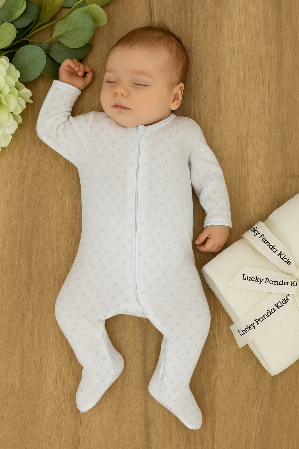 This Polka-Dot Dreams sleeper features a full-length zipper for easy dressing and quick changes. Crafted with comfort in mind, its soft fabric and secure closure make it ideal for restful sleep and convenience. Perfect for those seeking practical yet stylish sleepwear.