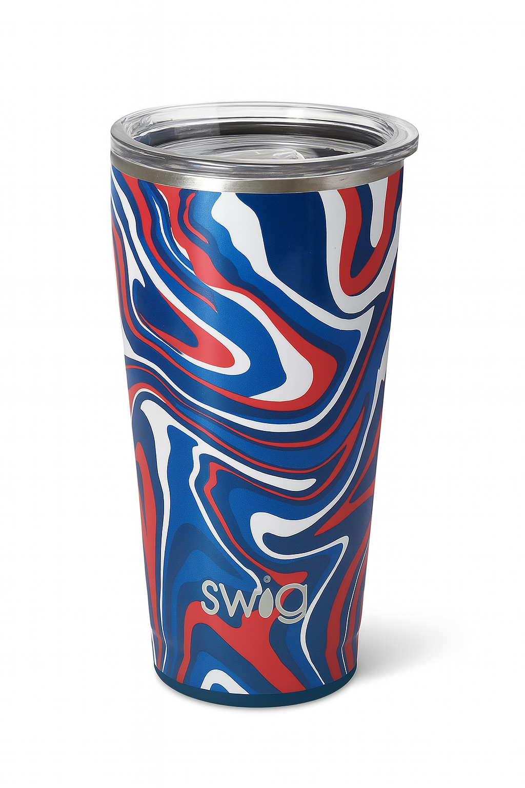 Experience vibrant patriotism with the Red White and Blue Swirl 24oz Swig. Crafted for durability and style, this insulated tumbler keeps your beverages hot or cold for hours. Its eye-catching swirl design adds a festive touch, perfect for everyday use or special occasions. Ideal for those who value both function and flair in their drinkware.